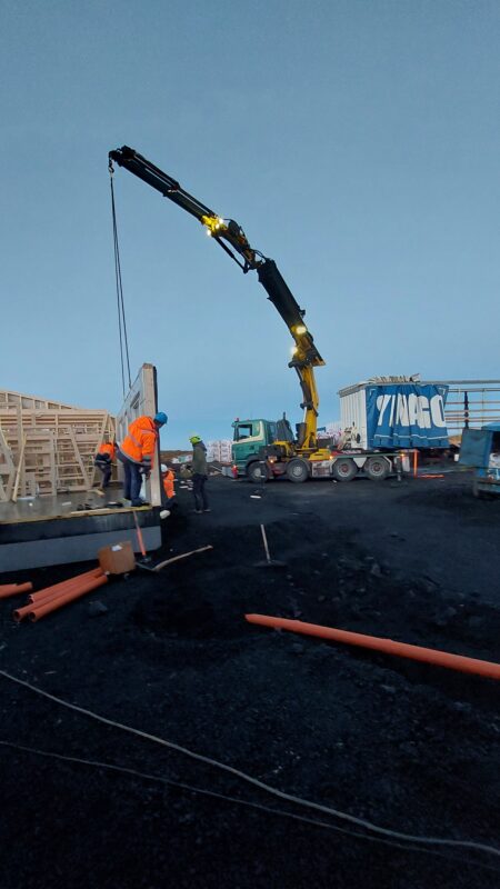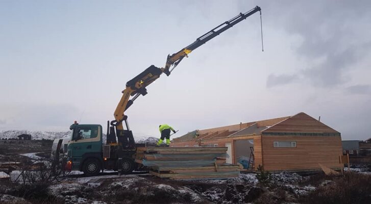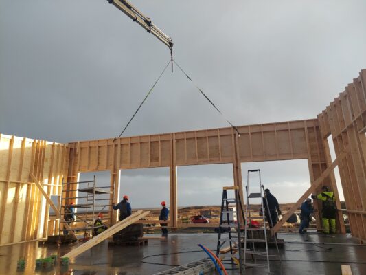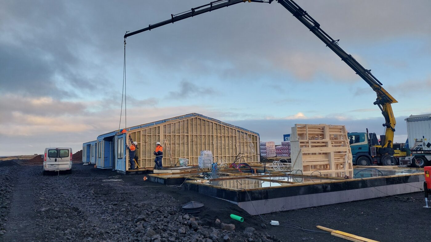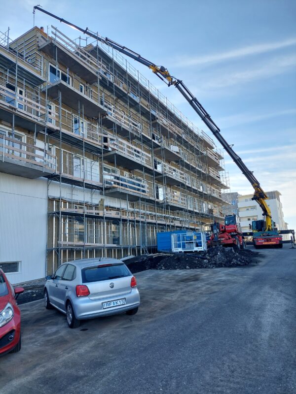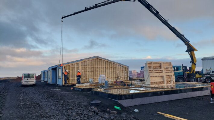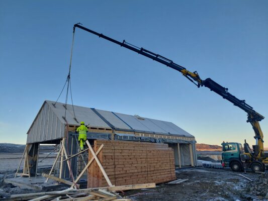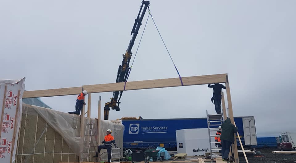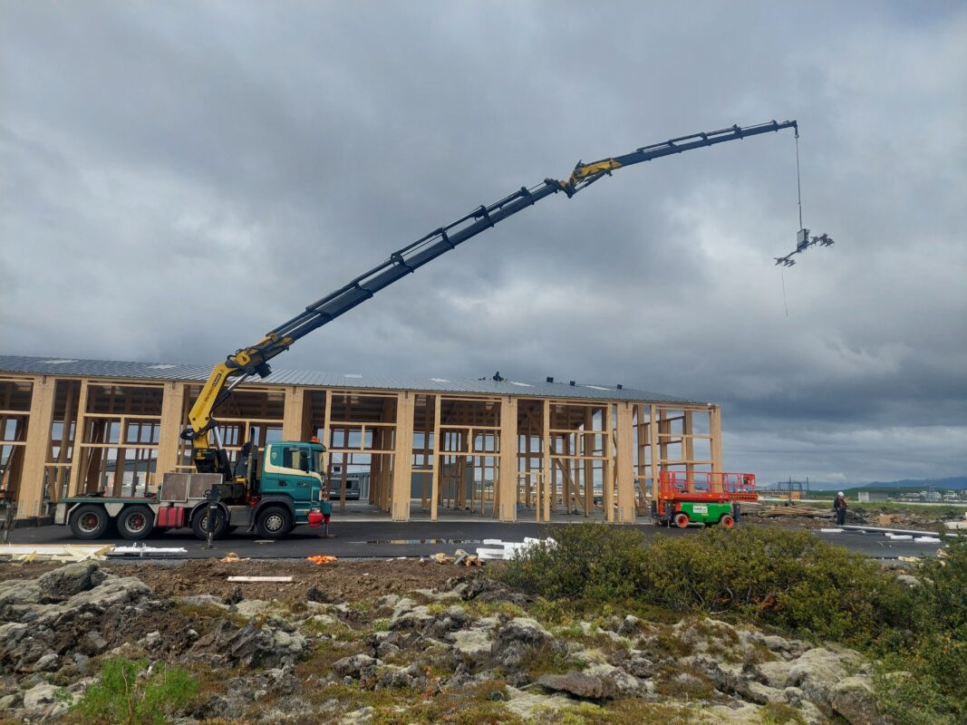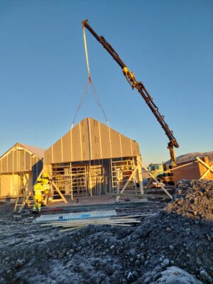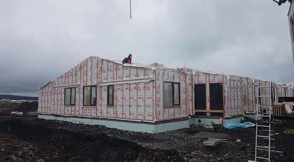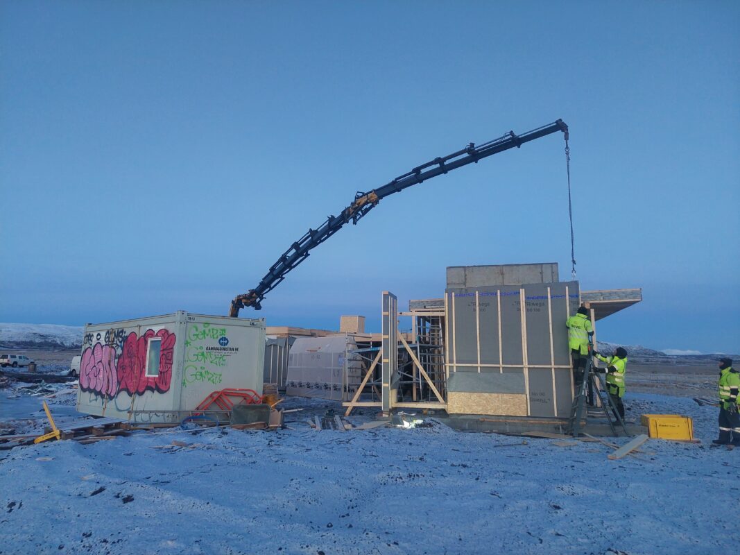 Hérna erum við að setja upp raðhús, sumarhús og límtrésskemmur.
