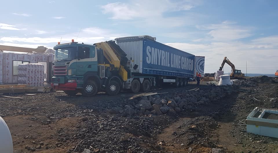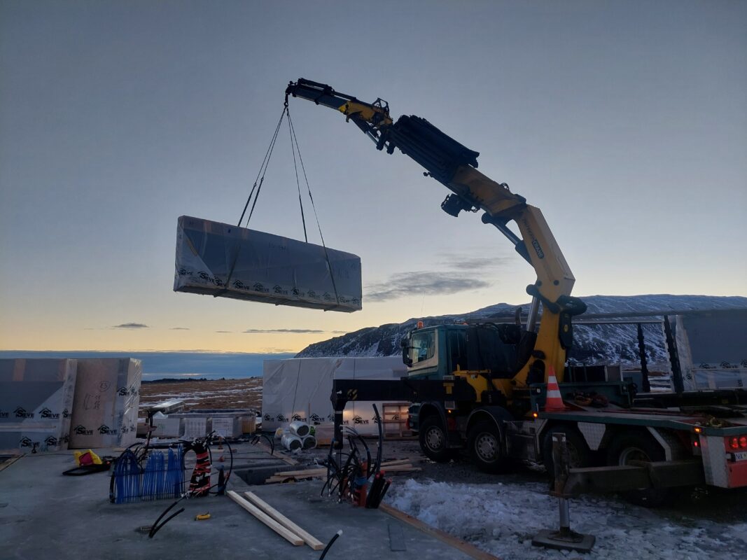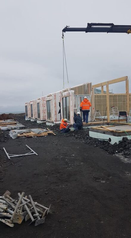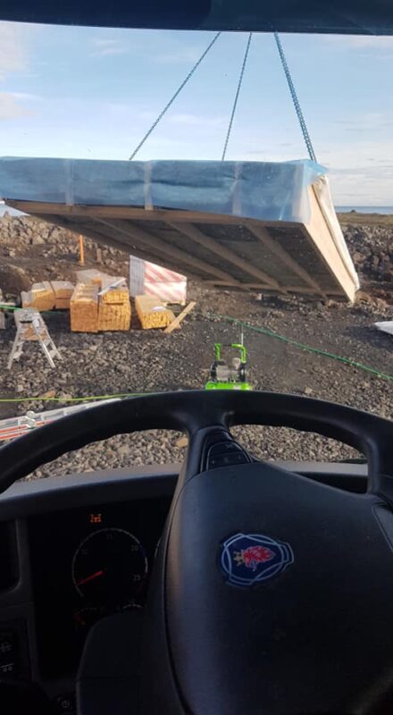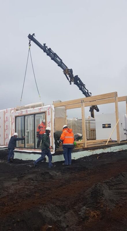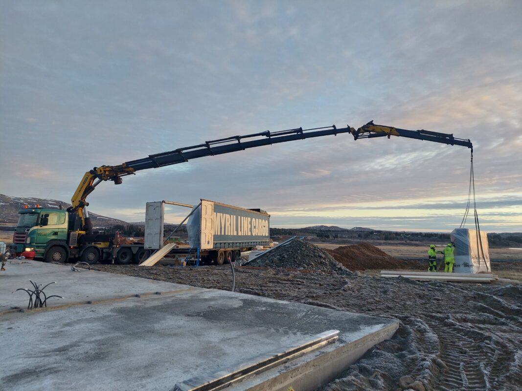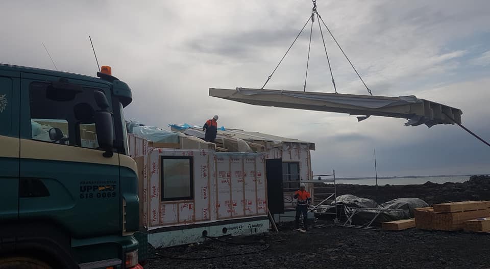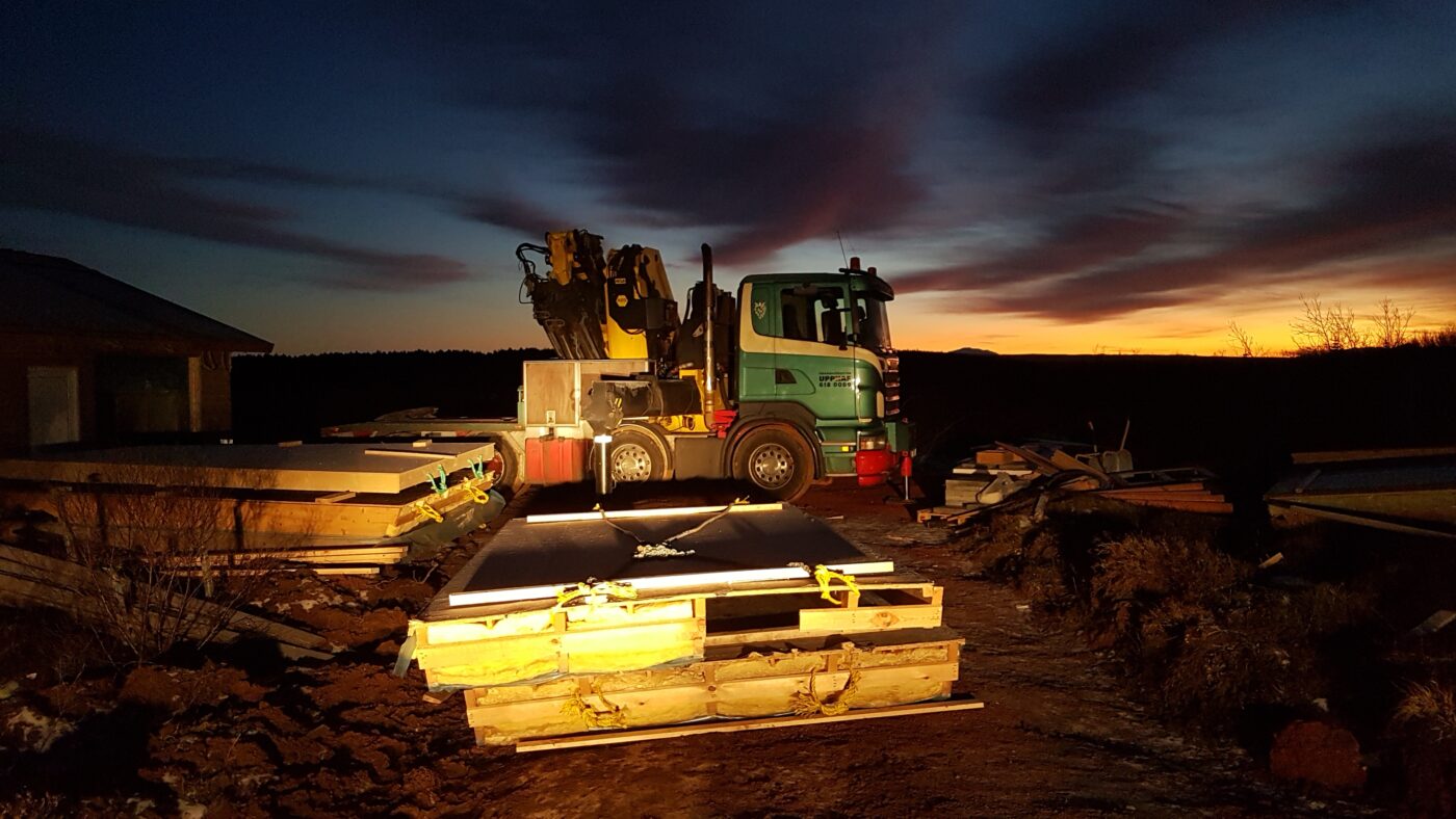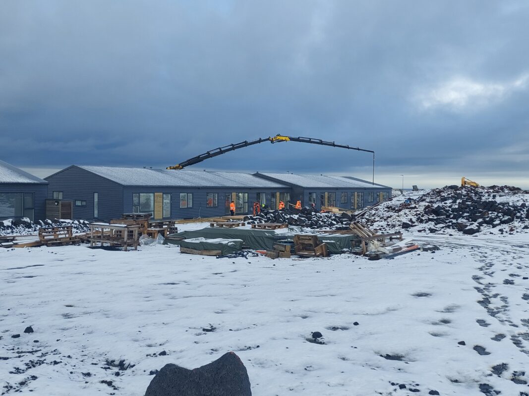 Hérna erum við að setja upp raðhús, sumarhús og límtrésskemmur.